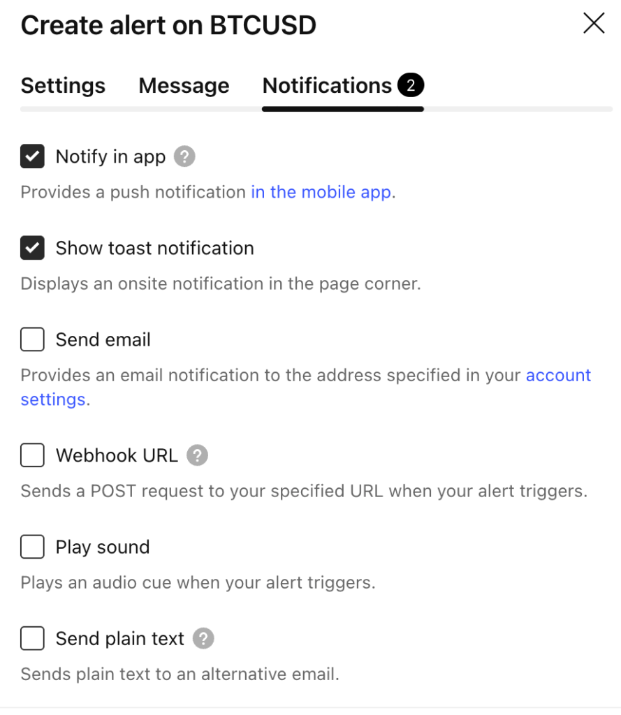 The message is what you’ll receive in your notifications or webhook. TradingView automatically generates a readable summary of your conditions, but you can edit it to include your own text, notes, or placeholders like price, volume, or symbol. This is especially helpful for mobile alerts or automated trading setups so you immediately know why the alert fired.