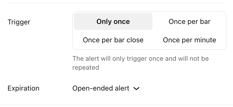 - Once per bar – Triggers anytime the conditions are met during the bar.