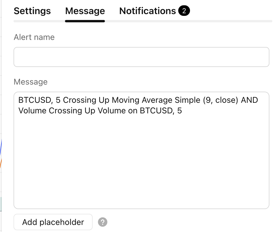 At the next tab, you can set a name and a custom message for your alert. The alert name helps you quickly recognize what the alert is about — especially useful if you manage many alerts. Keep it short but descriptive (e.g., “BTC EMA + Volume Breakout”).
